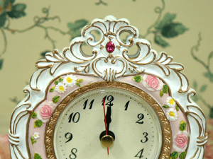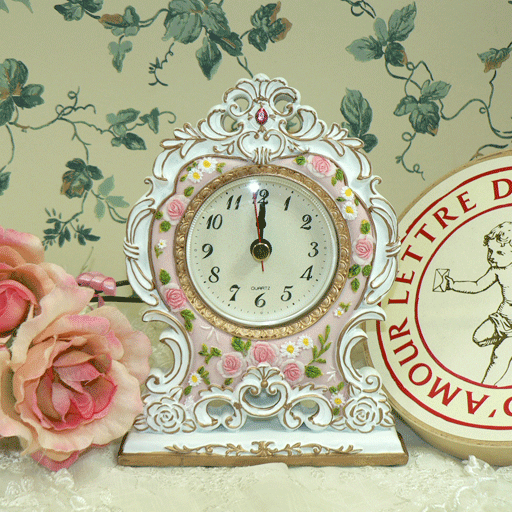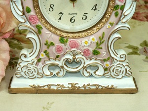 シンデレラの置き時計 サイズ 15.3cm*11.6cm*4.0cm 備考 散りばめられたミニバラがかわいらしい置時計。